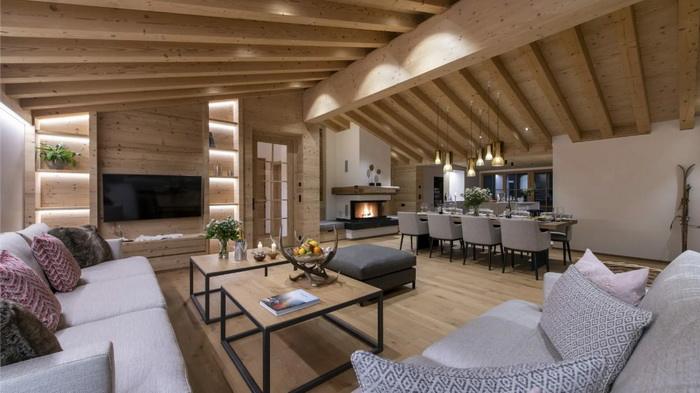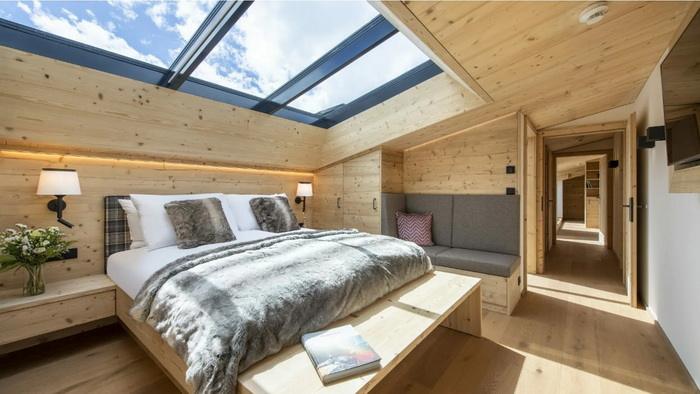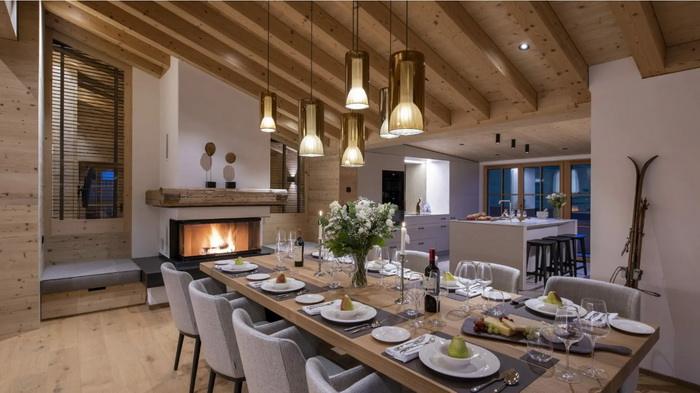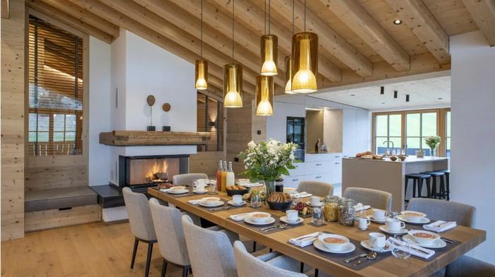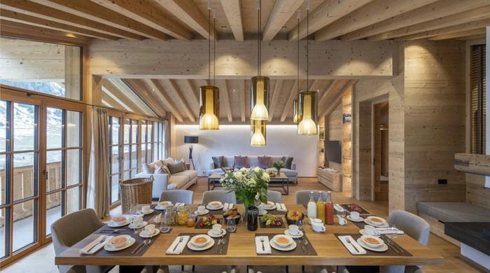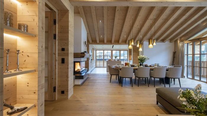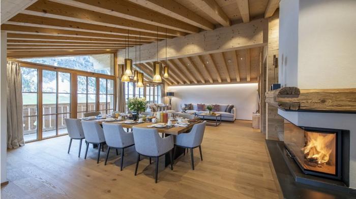The spacious open-plan living area features clean architectural lines, warm textiles, and elegant finishes. A striking wood-burning stove anchors the lounge, creating a cozy atmosphere for après-ski relaxation. Adjacent to the lounge is a refined dining space and a sleek, fully equipped kitchen designed for both style and functionality.