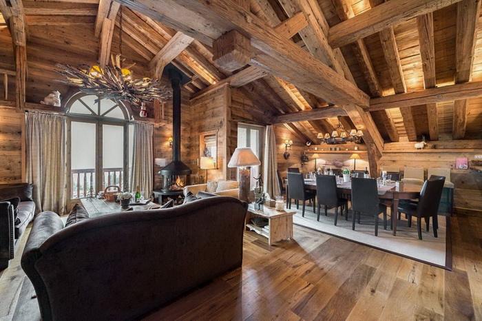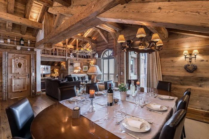 The spacious living areas are designed for memorable evenings together, with soaring ceilings, elegant furnishings, and alpine-inspired décor. A rustic chandelier and log-burning fireplace create a warm and inviting ambience, while the open-plan layout seamlessly blends the lounge, dining area, and fully equipped kitchen. French doors open onto a balcony with stunning mountain views.