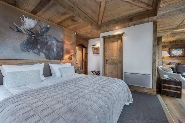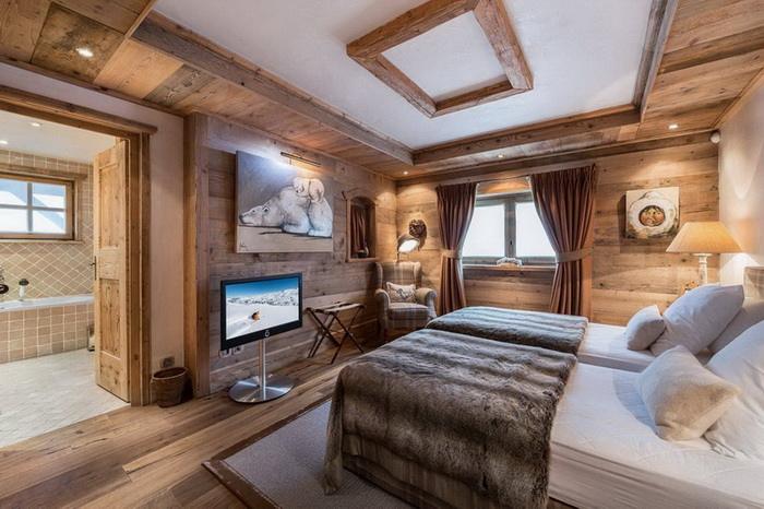 Five en-suite double bedrooms and a charming bunk room comfortably host 10 adults and 2 children. Each room exudes alpine character with warm wood paneling and authentic touches, while the master suite enjoys additional space, a dressing area, and a private balcony.
