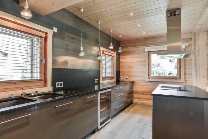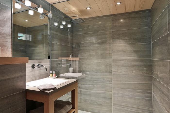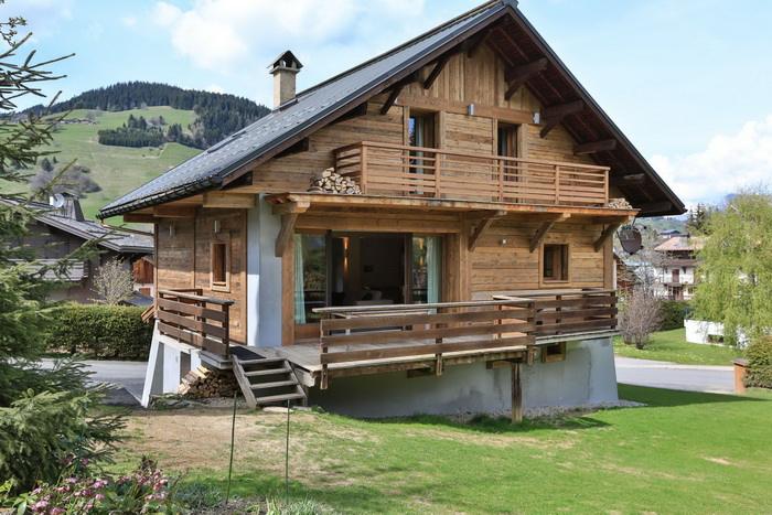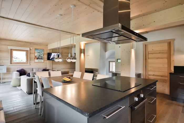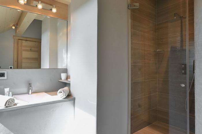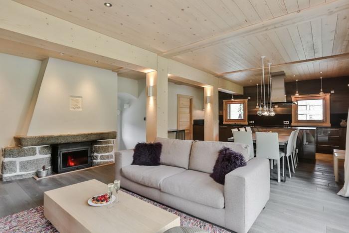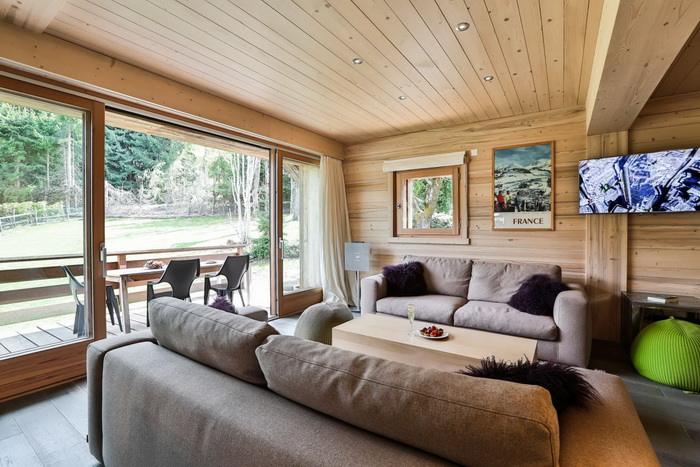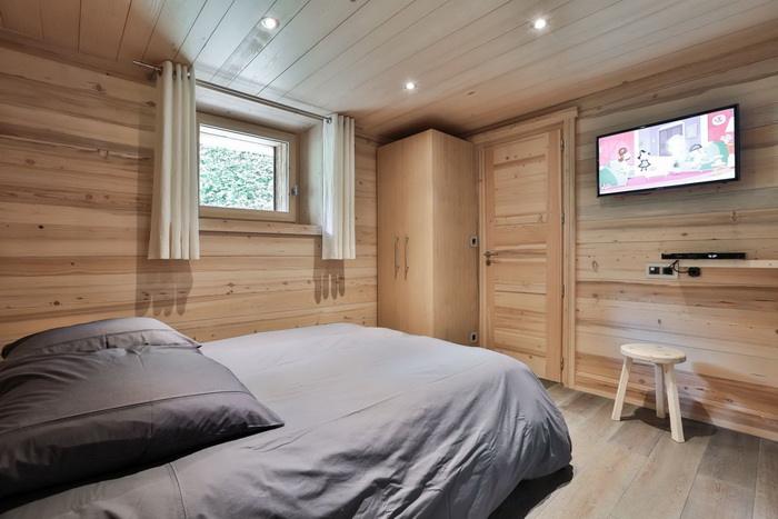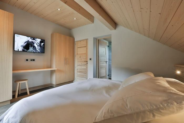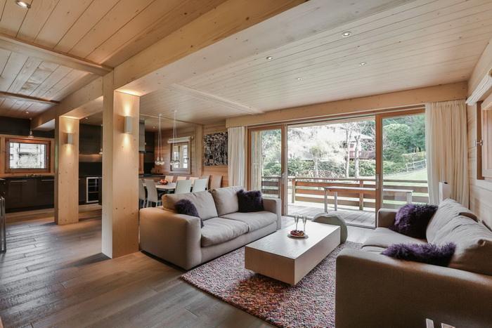 Set across three floors, the chalet’s first level hosts a bright, open-plan living space featuring warm wooden interiors and a welcoming fireplace — the perfect spot to unwind after a day on the slopes. The contemporary kitchen and dining area provide all modern conveniences for effortless home dining, while large sliding doors open onto a sunny balcony leading down to a private garden with picturesque mountain views.