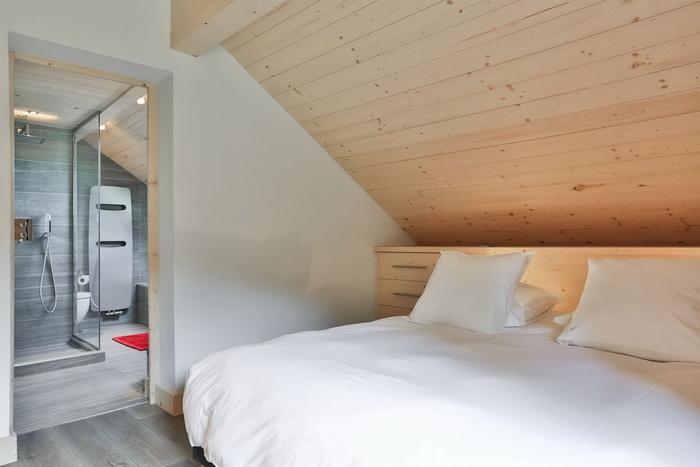 Chalet Penelope accommodates up to 8 guests across four serene double bedrooms, each with elegant en-suite bathrooms. The top-floor rooms share a private balcony, ideal for morning coffee or evening stargazing. Additional amenities include laundry facilities and three outdoor parking spaces, ensuring both comfort and convenience throughout your stay.
