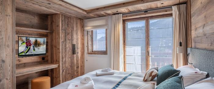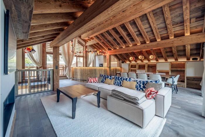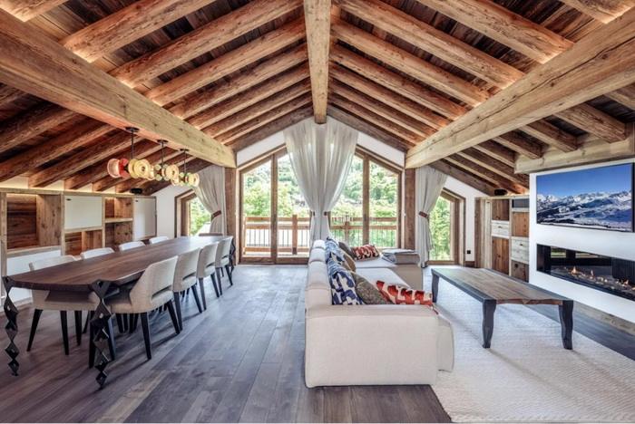Blending modern comfort and Savoyard charm, it offers a spacious cathedral-style living area with an open kitchen and panoramic mountain views from two balconies.
